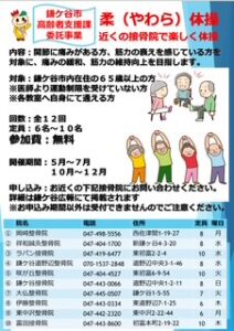 鎌ヶ谷市高齢者支援課からの委託事業。柔体操、5月、10月開催の2クール。前期、利用者募集中です。柔道整復師が自らの整骨院内で行う介護予防事業である健康体操を実施している自治体は稀で、東京都江戸川区、神奈川県座間市、大阪府内各市と千葉県船橋市、鎌ヶ谷市と数少ないです。レアなコンテンツを体験されることお勧めです。筋トレメニュー、ストレッチ体操ですが、65才以上の方対象でも充分に出来ますのでご安心ください。ちょこっと筋トレの効果は認められています。あのチョコザップはエビデンスに伴った事業展開だったんです。鎌ヶ谷市在住の高齢者の方のお電話をお待ちしています
